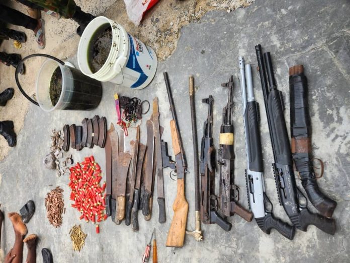 Edafe listed the arms and ammunition to include one AK-47 rifle, with five magazines loaded with 161 rounds of 7.62mm ammunition; one assault riffle with two magazines, loaded with 59 rounds of 5.56mm ammunition; two English pump-action guns; 110 rounds of live cartridges; one double barrel gun; one single barrel gun; one toy gun; cutlasses and a bunch of charms wrapped in a cap.