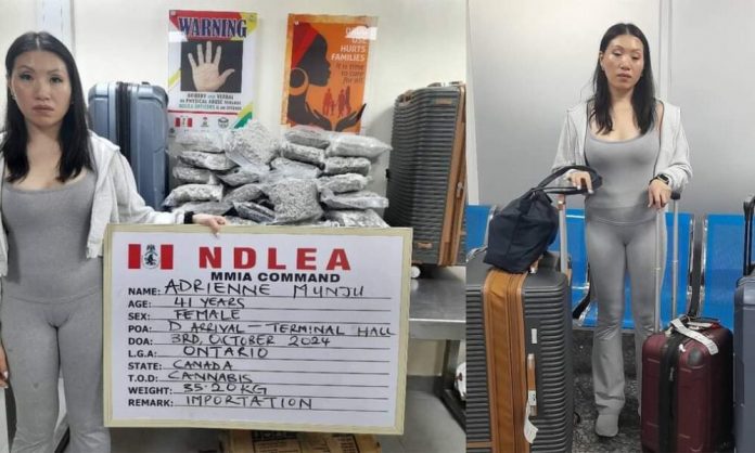 OPERATIVES of the National Drug Law Enforcement Agency (NDLEA) at the Murtala Muhammed International Airport (MMIA) in Ikeja, Lagos State, have arrested a 41-year-old Canadian lady, Adrienne Munju, for importing large consignment of ‘Canadian Loud,’ a strong strain of synthetic cannabis, into the country.