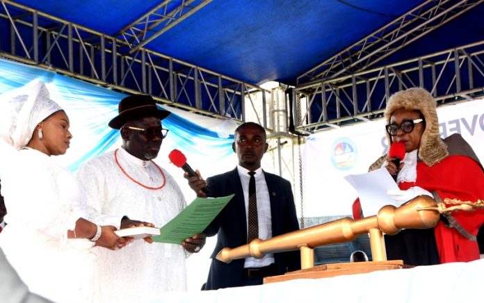 The state Chief Judge, Justice Theresa Diai, administered the oath of office on the governor at the ceremony held at Stephen Keshi Stadium in Asaba, the state capital, and witnessed by thousands of Deltans, who defied an early morning heavy rains and trooped to venue.