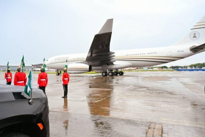 The jet conveying the President and some of his key aides took off from the Nnamdi Azikiwe International Airport, Abuja, at 04:08 pm on Monday.