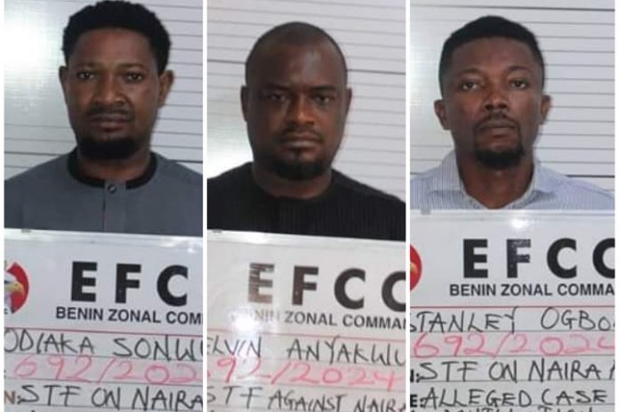 The EFCC, said in a statement, that the suspects, Stanley Ogbolu, 35; Odiaka Sorwu 42 and Kelvin Anyakwu, 42, were apprehended for Naira mutilation and abuse, following credible information, adding: “They were arrested in Asaba, Delta State, at a burial ceremony allegedly spraying naira notes on a celebrant.”